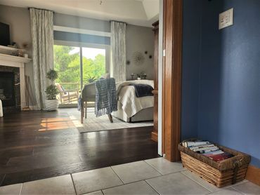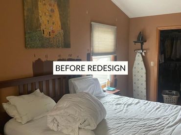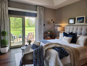 Another project of traditional honey-oak-turning-yellow over time, this ensuite was ready for a primary bedroom update. Opting for trendy white trim, a lighter wall color, luxury vinyl wood floors, and a pop of blue to incorporate nature and pull the outdoor elements in from the walkout deck, the Blue Meadow Bedroom Project was inspired, and completed in 2021.