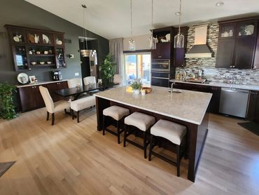 Down-Under was a project imagined in Southern Wisconsin during the peak of the 'stay-cation' measures when many were foregoing vacationing in 2020. Incorporating a 'lighter and brighter' feel, changing out carpeting to luxury vinyl plank (heated) flooring, and adding a full size refrigerator, dishwasher, and a two-tier granite countertop island that spaciously seats four was just what this lower level needed to incorporate additional entertaining options in this home.